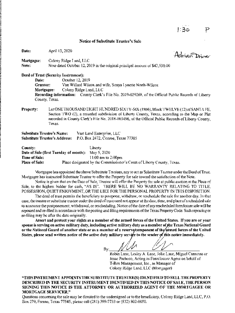 1:3DpNotice of Substitute Trustee\'s Sale Date:April 13, 2020Mortgagee: Note:Colony Ridge Land, LLC Note dated October 12, 2019, in the original principal amount of $42,530.00Deed of Trust (Security