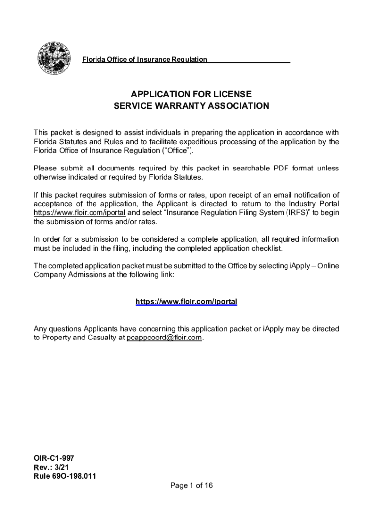 Florida Office of Insurance RegulationAPPLICATION FOR LICENSE SERVICE WARRANTY ASSOCIATION This packet is designed to assist individuals in preparing the application in accordance with Florida Statutes