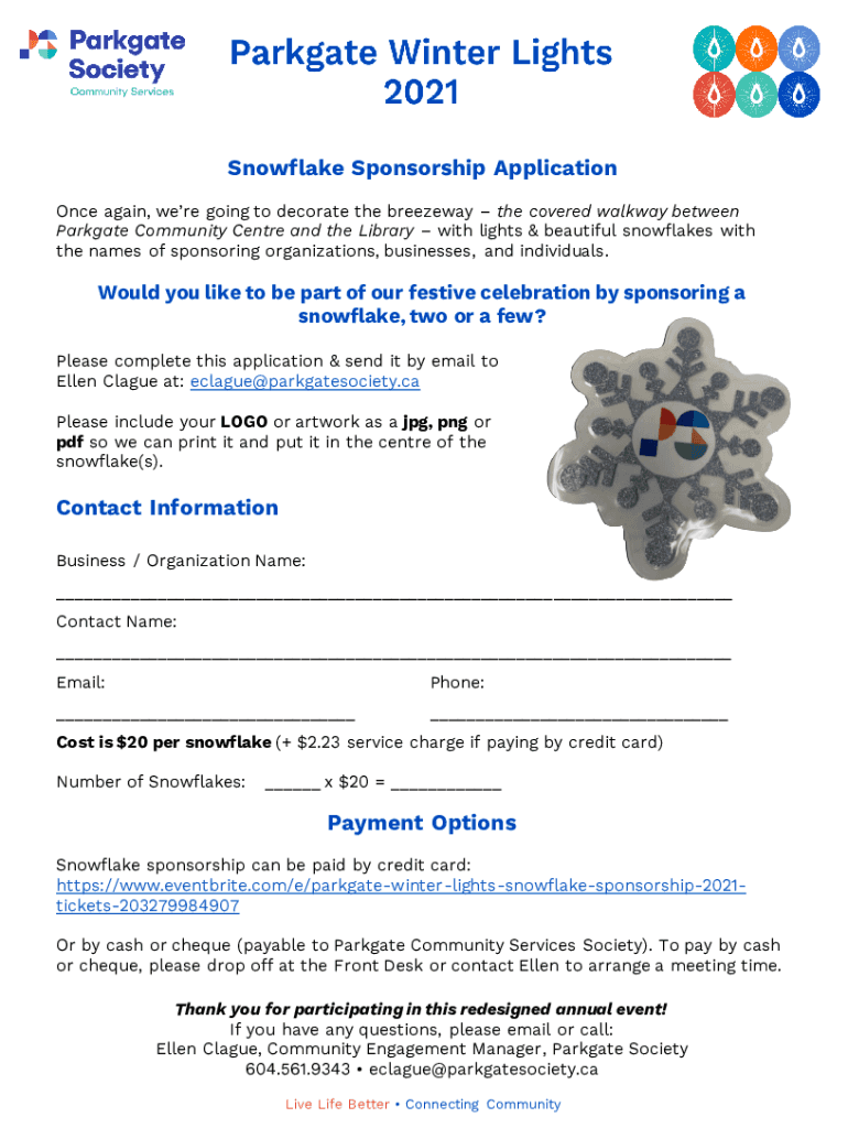 Snowflake Sponsorship Application Once again, were going to decorate the breezeway the covered walkway between Park gate Community Center and the Library with lights & beautiful snowflakes with the