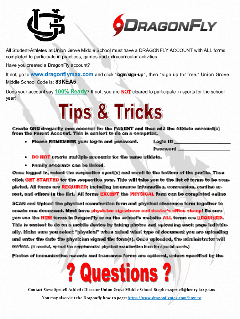 All StudentAthletes at Union Grove Middle School must have a DRAGONFLY ACCOUNT with ALL forms completed to participate in practices, games and extracurricular activities. Have you created a Dragonfly