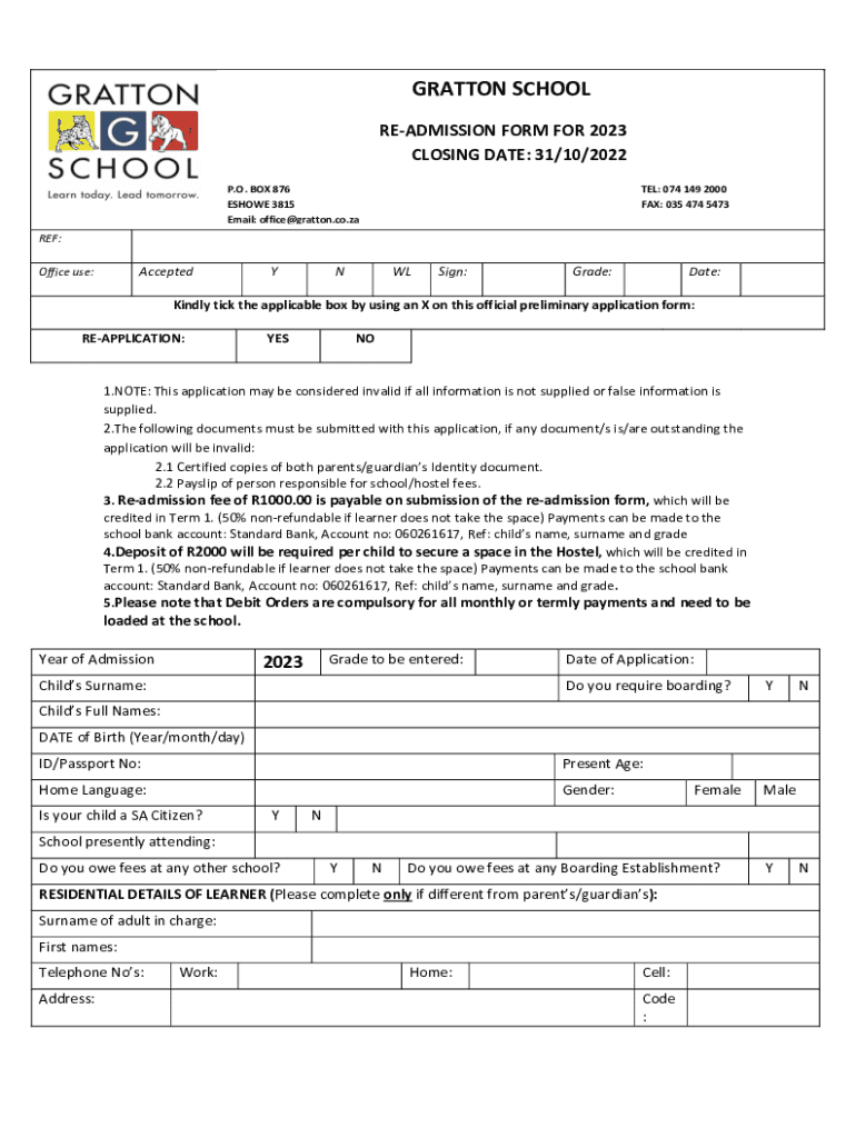 GRAFTON SCHOOL READMISSION FORM FOR 2023 CLOSING DATE: 31/10/2022 P.O. BOX 876 SHOW 3815 Email: office@gratton.co.zaTEL: 074 149 2000 FAX: 035 474 5473REF:AcceptedOffice use:Ensign:Grade:Date:Kindly