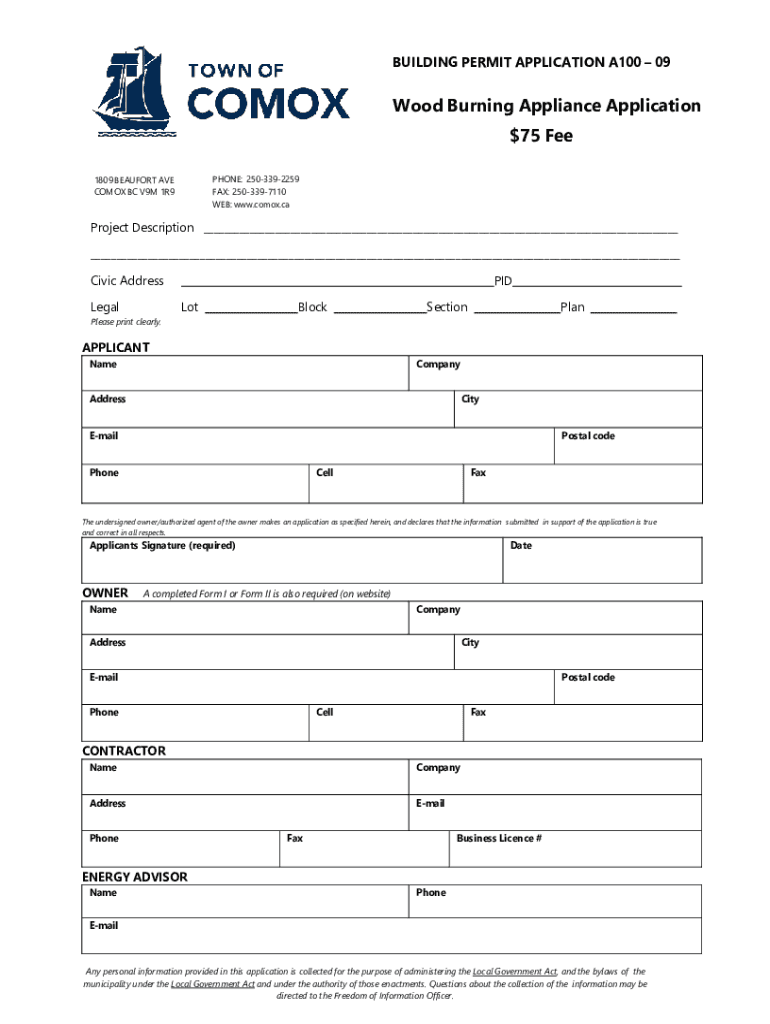BUILDING PERMIT APPLICATION A100 09Wood Burning Appliance Application $75 Freephone: 2503392259 FAX: 2503397110 WEB: www.comox.ca1809 BEAUFORT AVE COMO BC V9M 1R9Project Description ___ ___ Civic