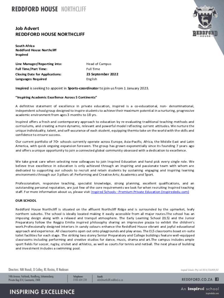Job Advert REDFORD HOUSE HEATHCLIFF South Africa Redford House North cliff Inspired Line Manager/Reporting into: Full Time/Part Time: Closing Date for Applications: Languages Required Head of Campus