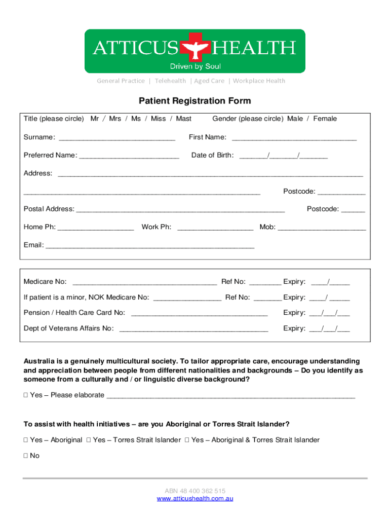 General Practice | Telehealth | Aged Care | Workplace HealthPatient Registration Form Title (please circle) Mr / Mrs / Ms / Miss / Mast Surname: ___ Preferred Name: ___Gender (please circle) Male