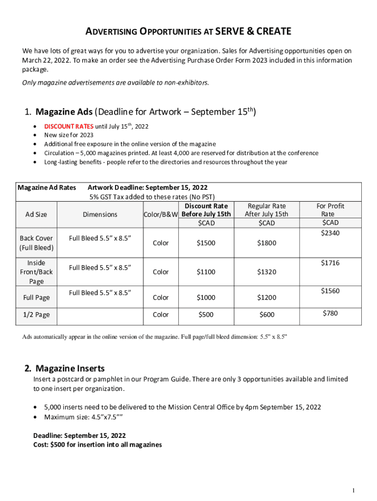 ADVERTISING OPPORTUNITIES AT SERVE & CREATE We have lots of great ways for you to advertise your organization. Sales for Advertising opportunities open on March 22, 2022. To make an order see the
