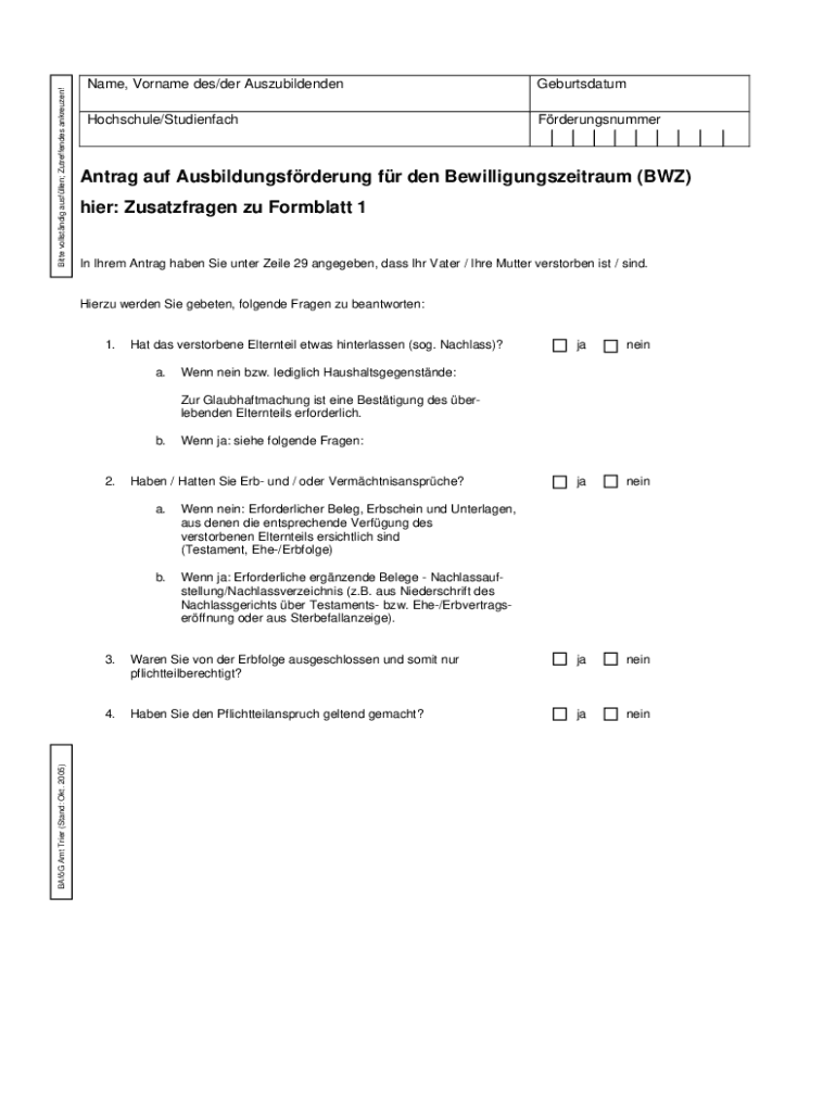 Bitter vollstndig Allen; Zutreffendes ankreuzen! Name, Surname DES/her AuszubildendenGeburtsdatumHochschule/StudienfachFrderungsnummerAntrag AUF Ausbildungsfrderung for den Bewilligungszeitraum (BWF)