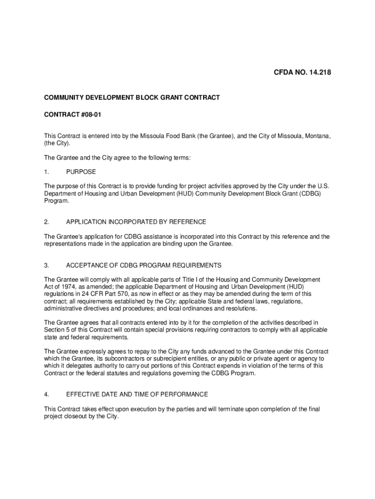 CODA NO. 14.218COMMUNITY DEVELOPMENT BLOCK GRANT CONTRACT #0801 This Contract is entered into by the Missoula Food Bank (the Grantee), and the City of Missoula, Montana, (the City). The Grantee and