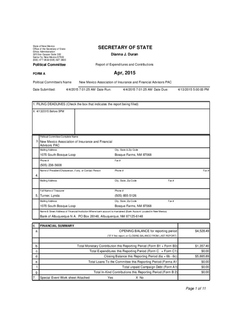 State of New Mexico Office of the Secretary of State Ethics Administration 325 Don Gaspar Suite 300 Santa Fe, New Mexico 87503 (800) 4773632/(505) 8273600SECRETARY OF STATEPolitical CommitteeReport