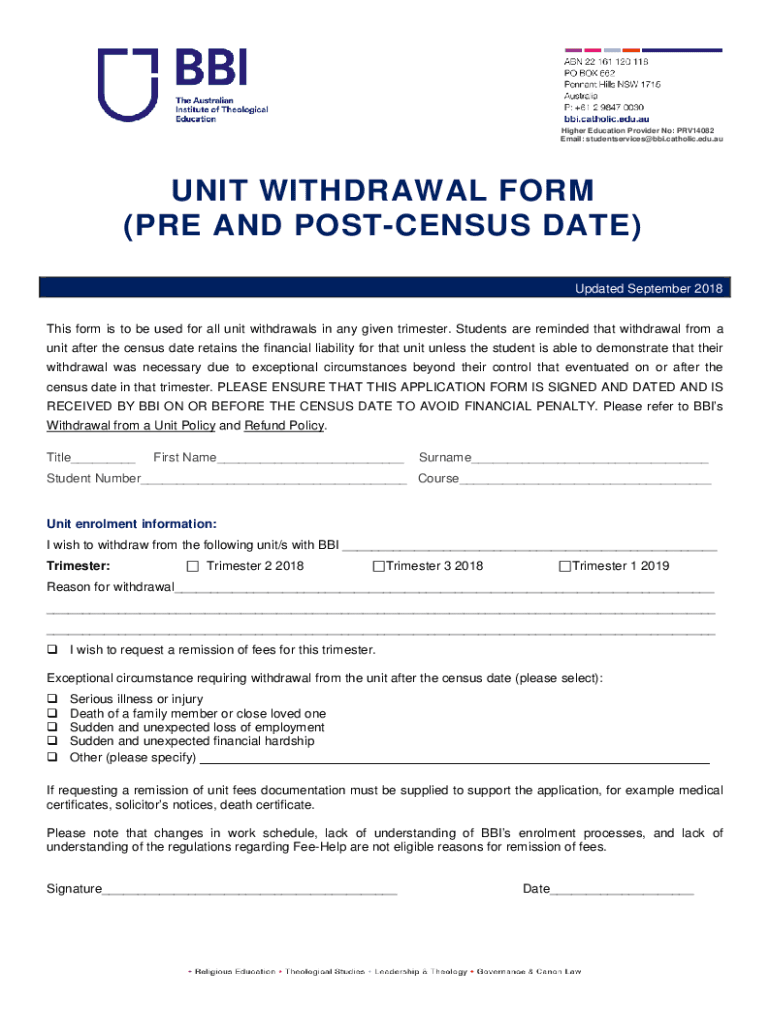 Higher Education Provider No: PRV14082 Email: studentservices@bbi.catholic.edu.auUNIT WITHDRAWAL FORM (PRE AND POSTCENSUS DATE) Updated September 2018 This form is to be used for all unit withdrawals