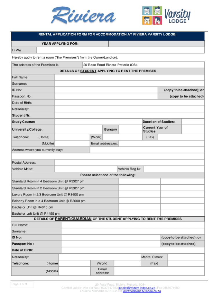 Riviera RENTAL APPLICATION FORM FOR ACCOMMODATION AT RIVIERA VARSITY LODGE:: YEAR APPLYING FOR: I / We Hereby apply to rent a room (the Premises) from the Owner/Landlord. The address of the Premises