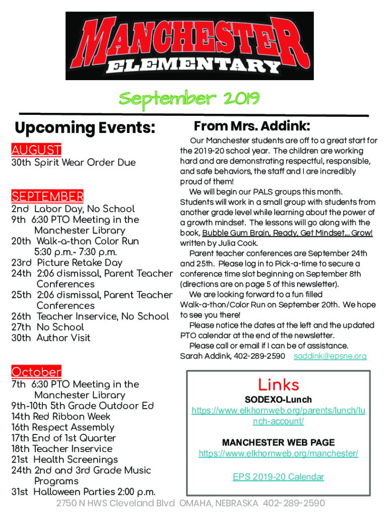 September 2019 Upcoming Events:From Mrs. Adding:Our Manchester students are off to a great start for the 201920 school year. The children are working AUGUST hard and are demonstrating respectful,