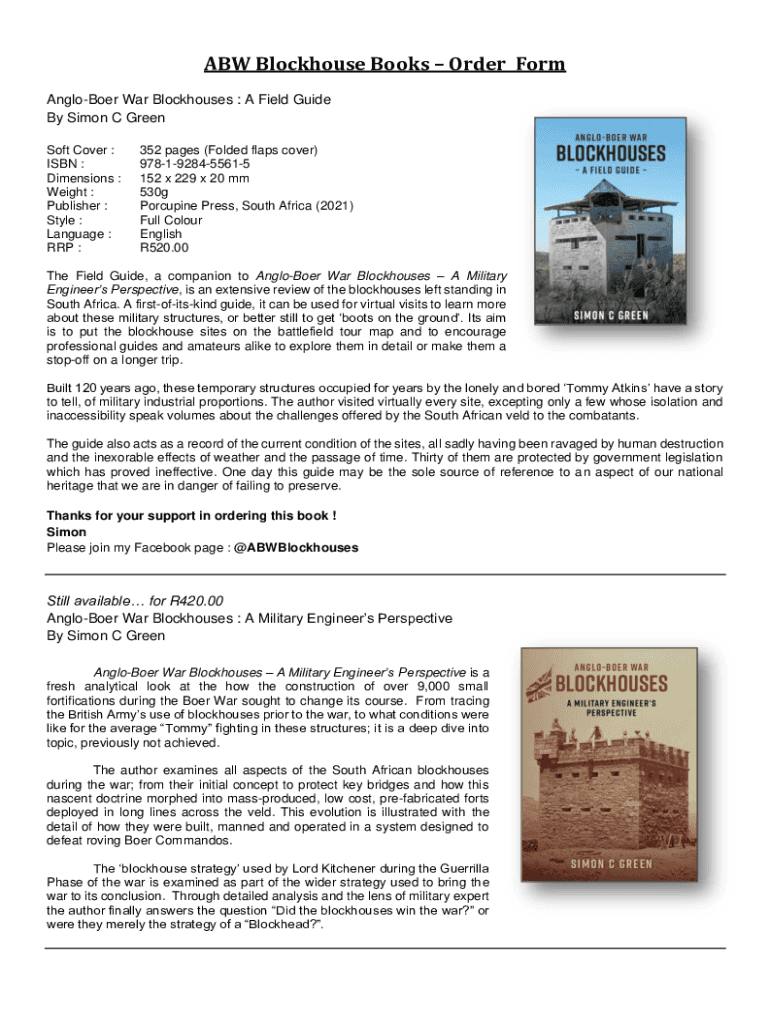 ABW Blockhouse Books Order Form Anglo-Boer War Blockhouses : A Field Guide By Simon C Green Soft Cover : ISBN : Dimensions : Weight : Publisher : Style : Language : RAP :352 pages (Folded flaps cover)