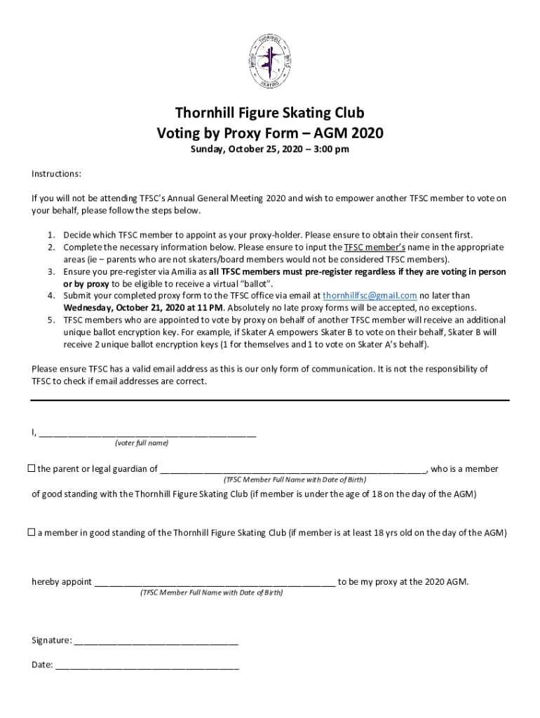 Thorn hill Figure Skating Club Voting by Proxy Form AGM 2020 Sunday, October 25, 2020 3:00 pm Instructions: If you will not be attending TFS Cs Annual General Meeting 2020 and wish to empower another