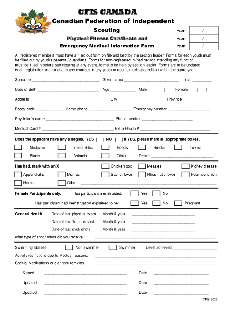 CFS CANADACanadian Federation of Independent ScoutingYEAR/Physical Fitness Certificate Andrea/Emergency Medical Information Former/All registered members must have a filled out form on file and kept