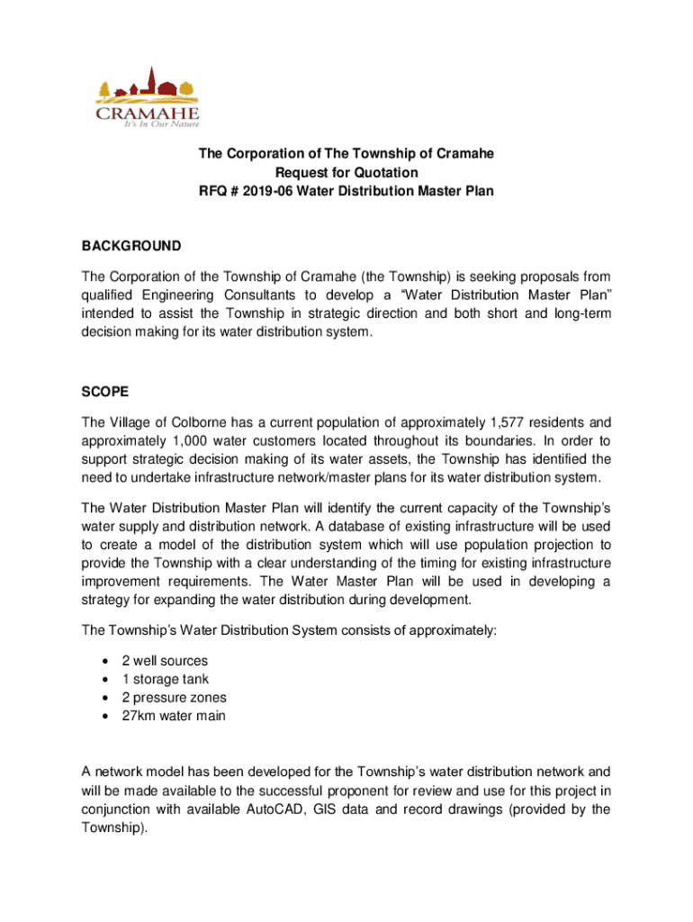 The Corporation of The Township of Cremate Request for Quotation RFQ # 201906 Water Distribution Master PlanBACKGROUND The Corporation of the Township of Cremate (the Township) is seeking proposals