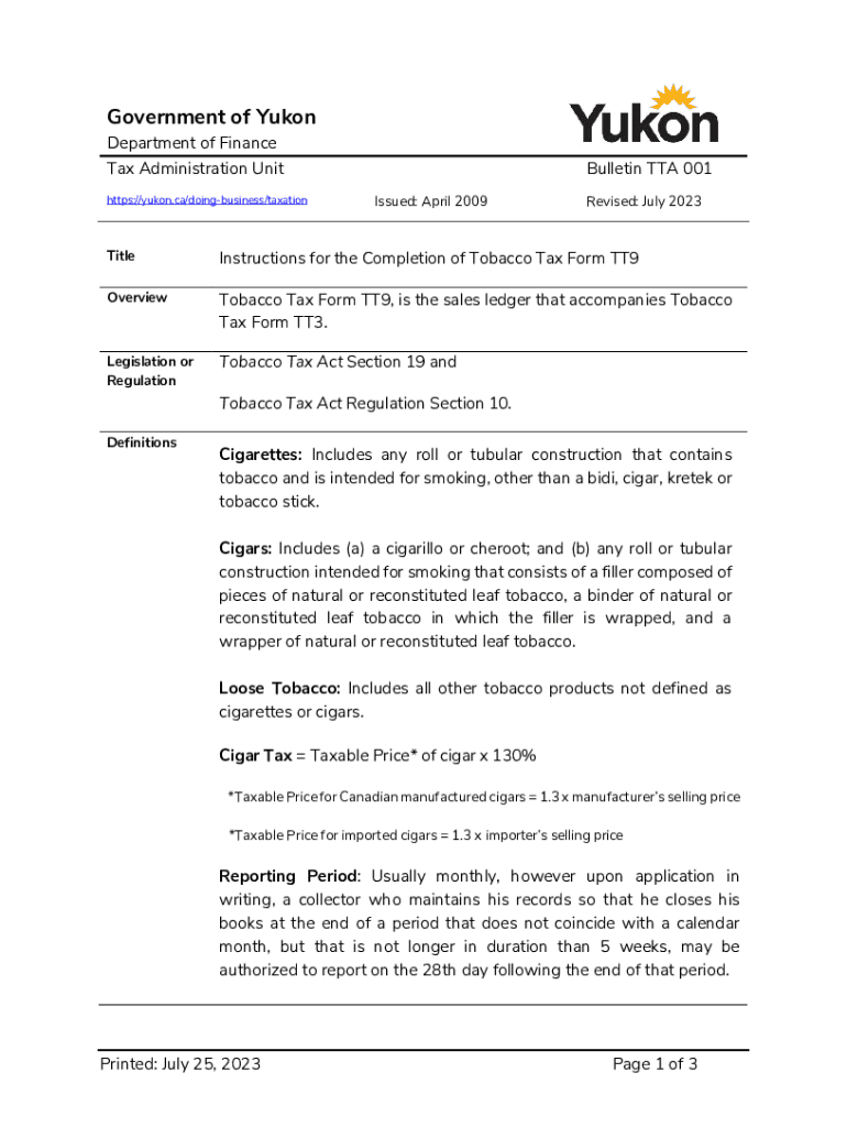 Government of Yukon Department of Finance Tax Administration Unit https://yukon.ca/doingbusiness/taxationBulletin TTA 001 Issued: April 2009Revised: July 2023TitleInstructions for the Completion of