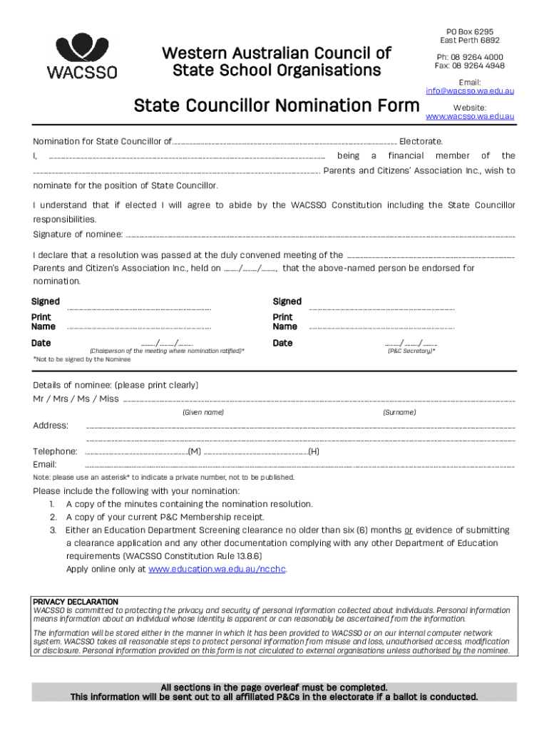 Western Australian Council of State School OrganisationsState Councillor Nomination Form PO Box 6295 East Perth 6892 pH: 08 9264 4000 Fax: 08 9264 4948 Email: info@wacsso.wa.edu.au Website: www.wacsso.wa.edu.auNomination