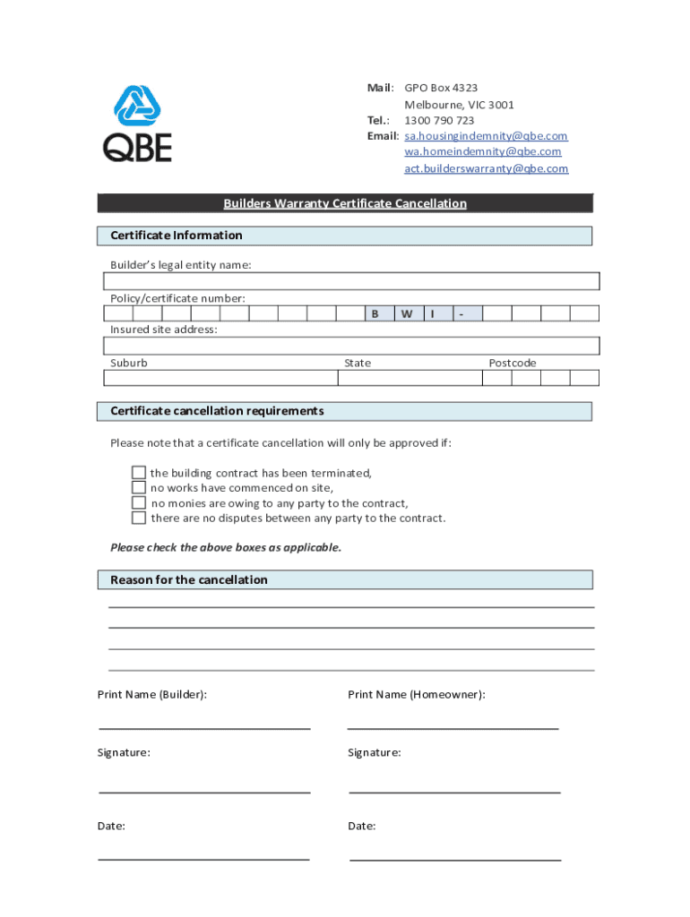 Mail: GPO Box 4323 Melbourne, VIC 3001 Tel.: 1300 790 723 Email: sa.housingindemnity@qbe.com wa.homeindemnity@qbe.com act.builderswarranty@qbe.com)ACT_(ACT)Builders Warranty Certificate Cancellation