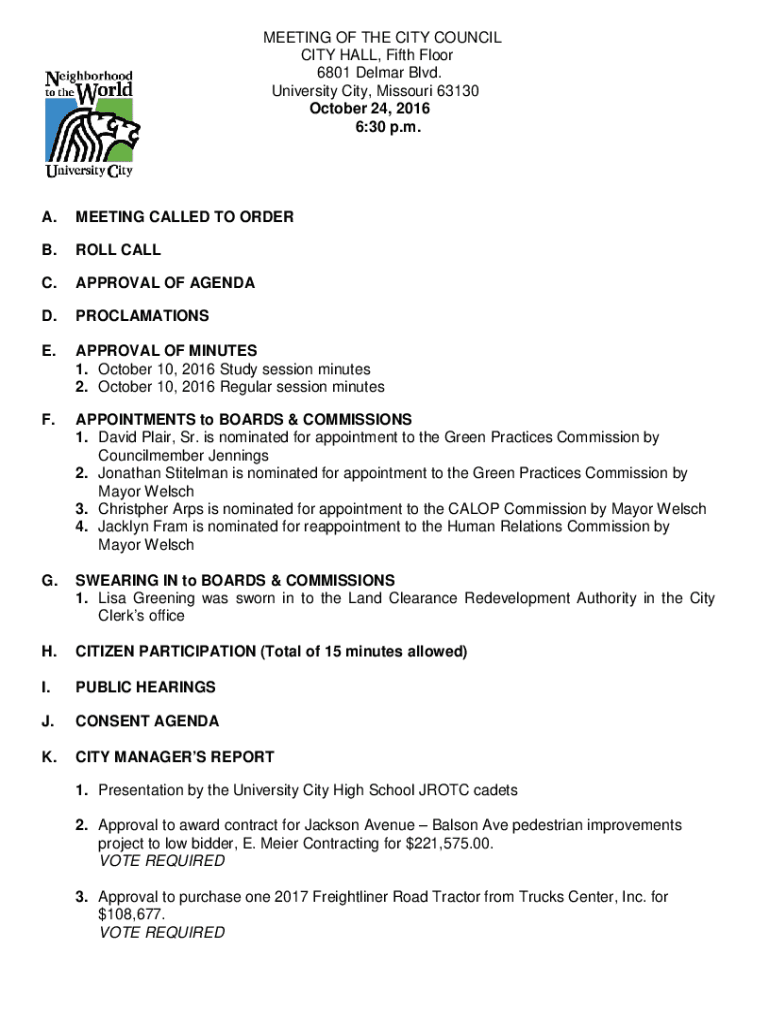 MEETING OF THE CITY COUNCIL CITY HALL, Fifth Floor 6801 Delmar Blvd. University City, Missouri 63130 October 24, 2016 6:30 p.m.A.MEETING CALLED TO ORDER.ROLL CALL.APPROVAL OF AGENDA.PROCLAMATIONS.APPROVAL