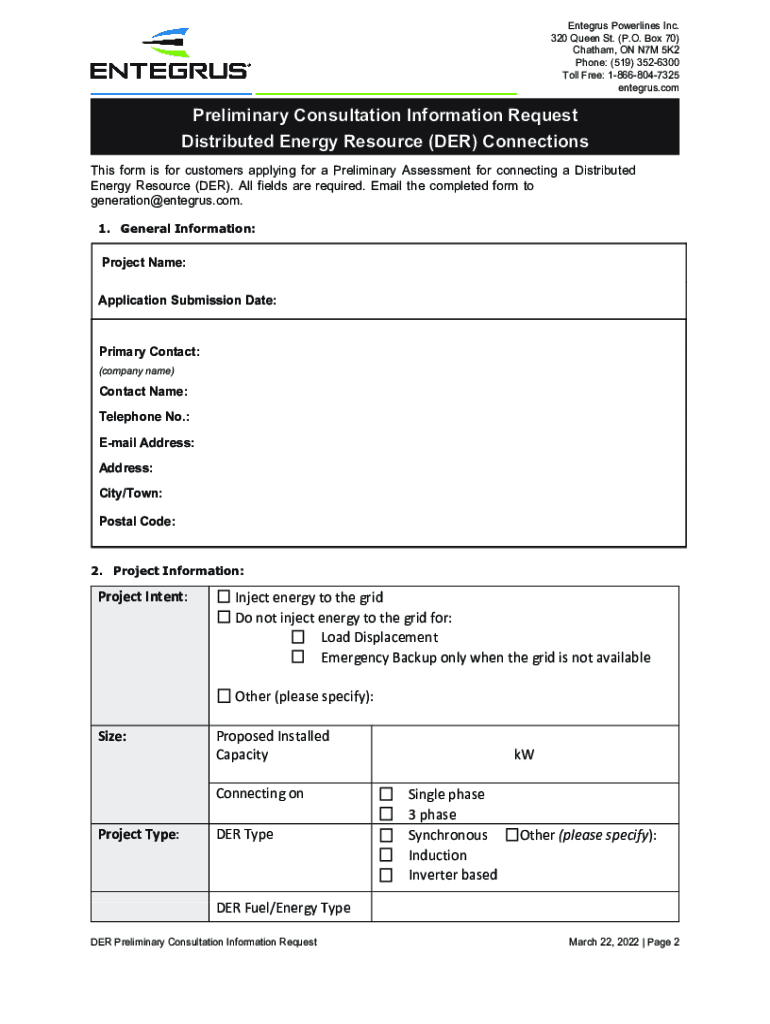 Enters Power lines Inc. 320 Queen St. (P.O. Box 70) Chatham, ON N7M 5K2 Phone: (519) 3526300 Toll Free: 18668047325 enters. Preliminary Consultation Information Request Distributed Energy Resource