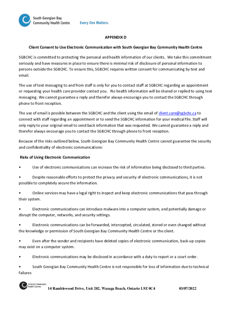 APPENDIX D Client Consent to Use Electronic Communication with South Georgian Bay Community Health Center SGB CHC is committed to protecting the personal and health information of our clients. We