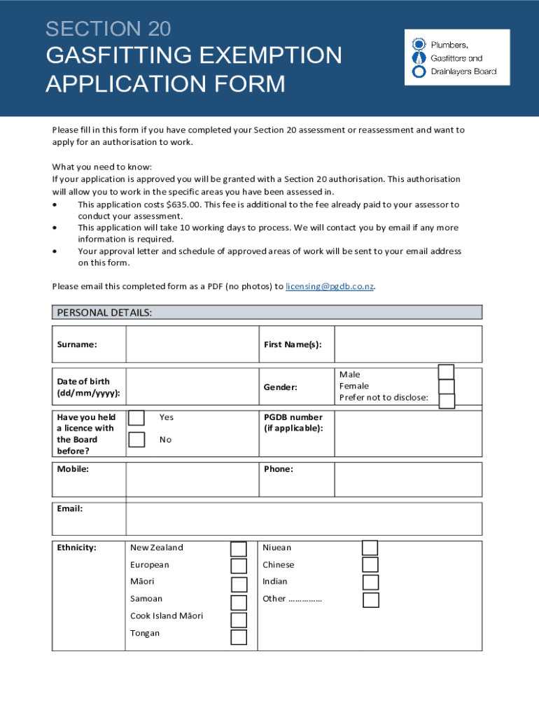 SECTION 20GASFITTING EXEMPTION APPLICATION FORM Please fill in this form if you have completed your Section 20 assessment or reassessment and want to apply for an authorization to work. What you need