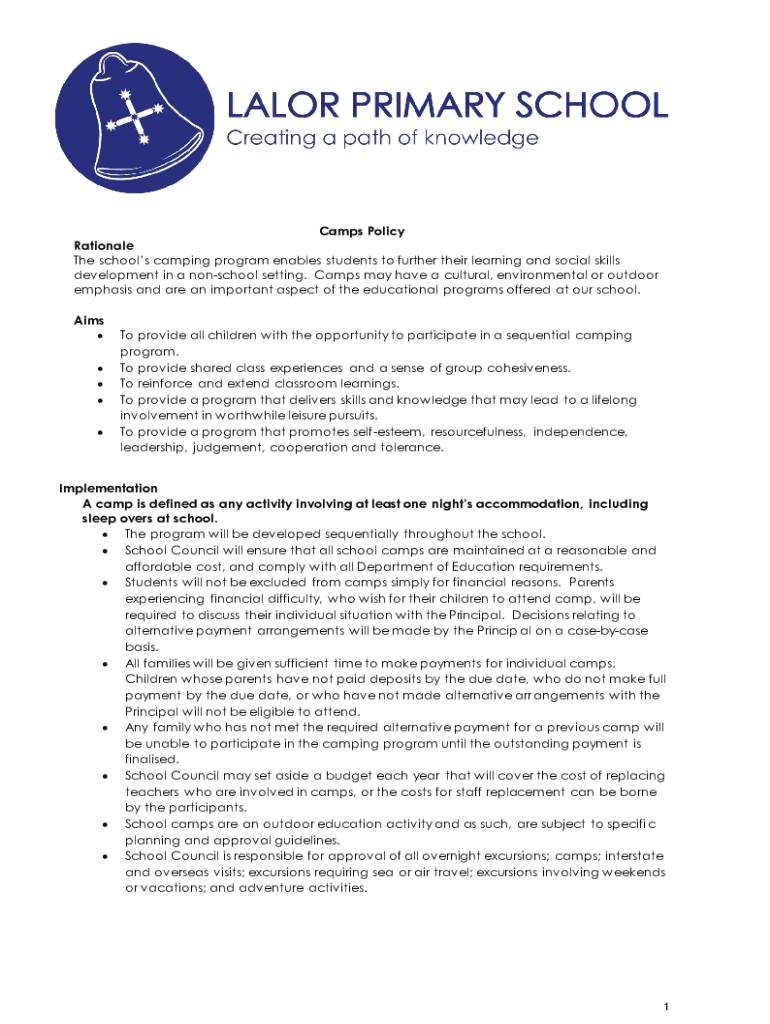 Camps Policy Rationale The schools camping program enables students to further their learning and social skills' development in a nonschool setting. Camps may have a cultural, environmental or outdoor