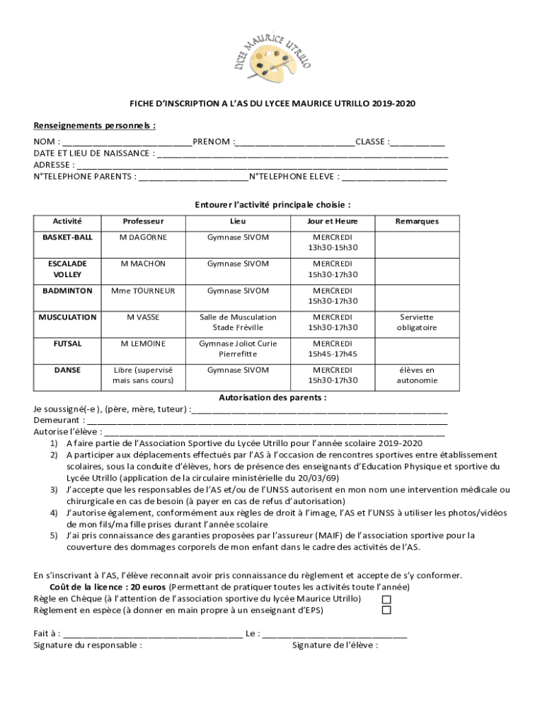 FICHE INSCRIPTION A LAS DU LYCÉE MAURICE UTRILLO 20192020Renseignements personnel :NOT : ___PHENOM :___CLASS :___DATE ET LIEU DE RENAISSANCE : ___ADDRESS : ___TELEPHONE PARENTS : ___TELEPHONE ELEVEN : ___Ensurer activity principal choice :ActivitProfesseurLieuJour et HeureRemarquesBASKETBALLM DAGORNEGymnase SIVOMMERCREDI13h3015h30ESCALADEVOLLEYM MACHONGymnase SIVOMMERCREDI15h3017h30BADMINTONMme TOURNEURGymnase SIVOMMERCREDI15h3