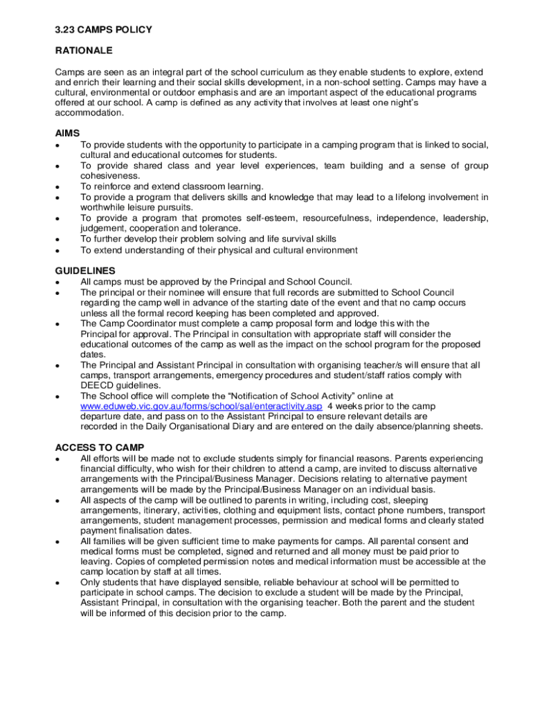 3.23 CAMPS POLICY RATIONALE Camps are seen as an integral part of the school curriculum as they enable students to explore, extend and enrich their learning and their social skills development, in