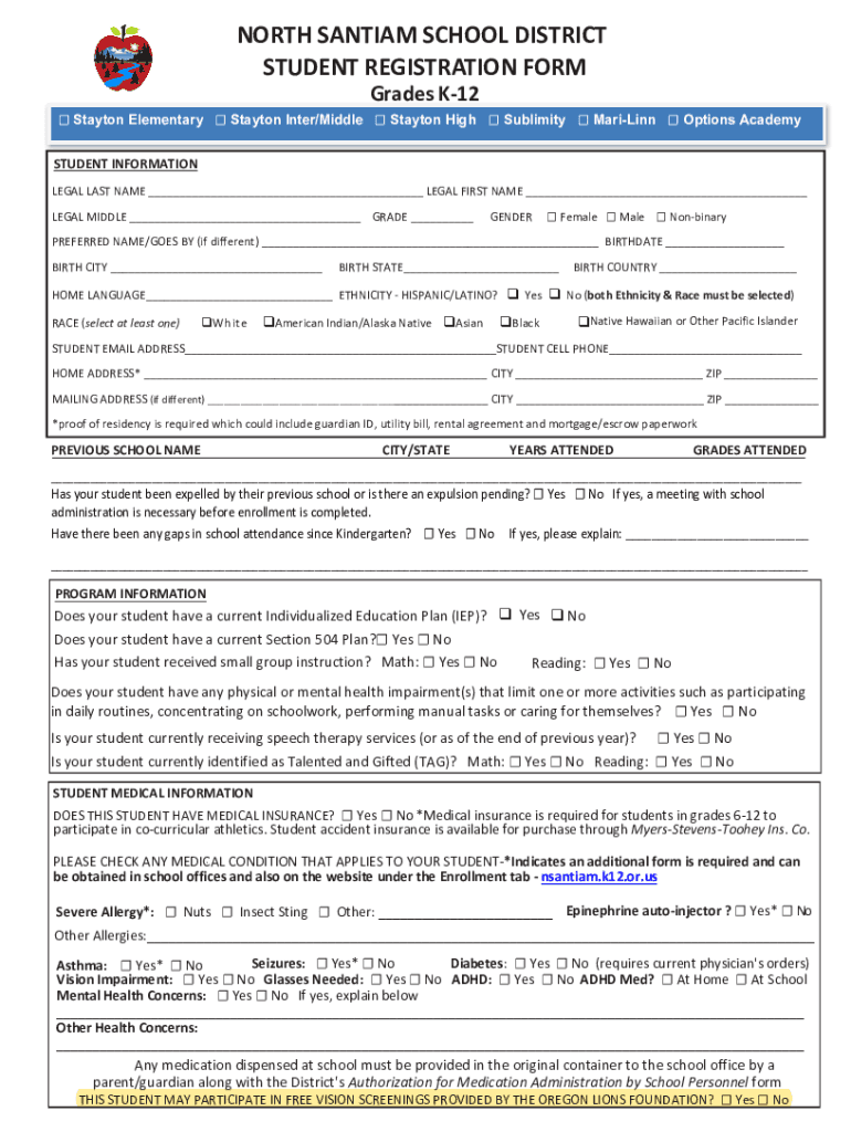 NORTH SANTA SCHOOL DISTRICT STUDENT REGISTRATION FORM Grades K12 Stanton Elementary Stanton Inter/Middle Stanton High Sublimity Mailing Options AcademySTUDENT INFORMATION LEGAL LAST NAME ___ LEGAL