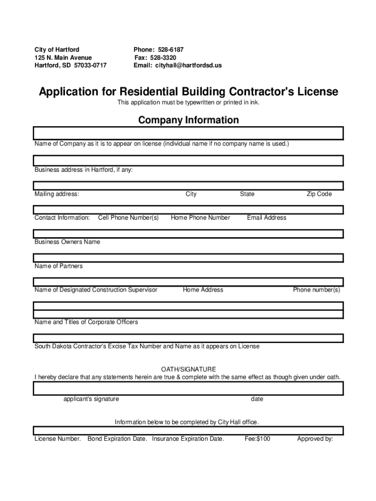 City of Hartford 125 N. Main Avenue Hartford, SD 570330717Phone: 5286187 Fax: 5283320 Email: cityhall@hartfordsd.usApplication for Residential Building Contractor\'s License This application must