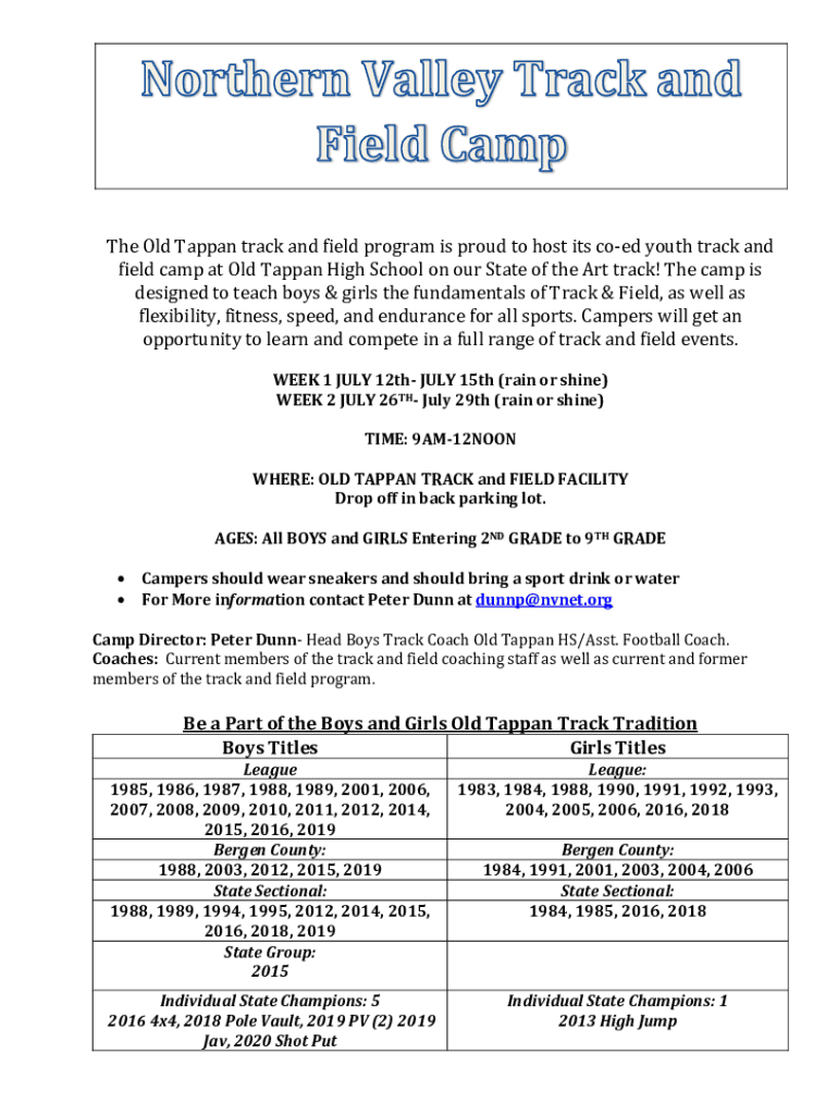 The Old Tap pan track and field program is proud to host its coed youth track and field camp at Old Tap pan High School on our State-of-the-Art track! The camp is designed to teach boys & girls the