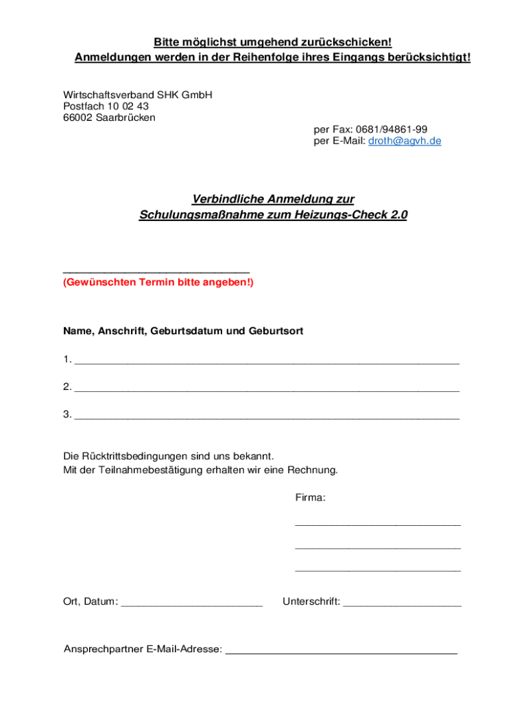 Anmeldungen warden in her Reihenfolge hires Singeing bercksichtigt! Wirtschaftsverband SHK GmbH