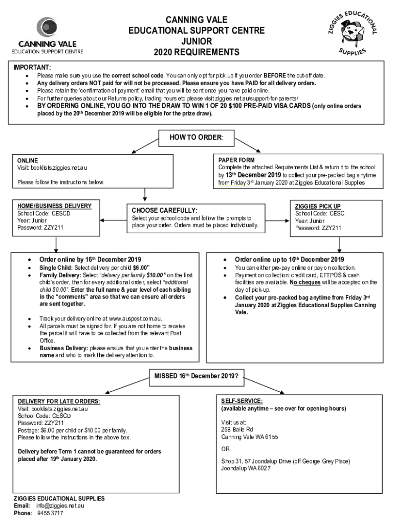 CANNING VALE EDUCATIONAL SUPPORT Center JUNIOR 2020 REQUIREMENTS IMPORTANT: Please make sure you use the correct school code. You can only opt for pickup if you order BEFORE the cutoff date. Any delivery