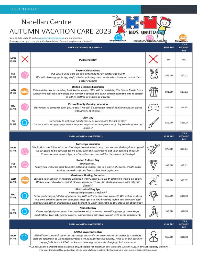 KIDS UNITED OSHCNarellan Center AUTUMN VACATION CARE 2023 New to Kids United? Go to www.kidsunited.com.au and enrol online. Bookings now open, complete the form below. Be quick as places are limited!