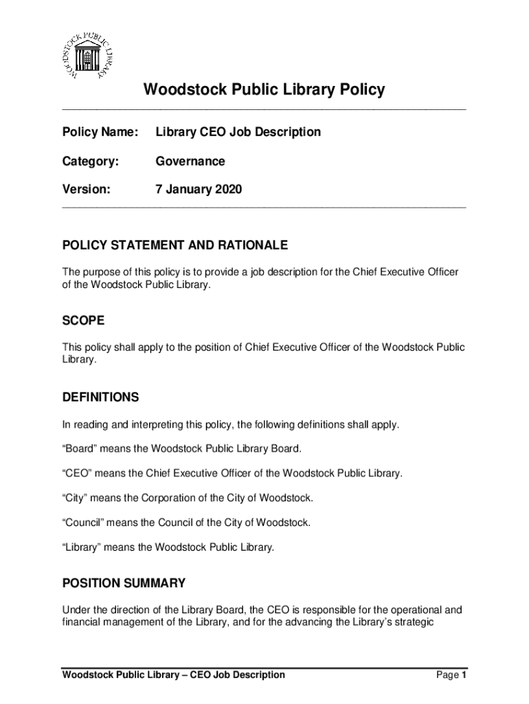 Woodstock Public Library Policy ___Policy Name:Library CEO Job DescriptionCategory:GovernanceVersion:7 January 2020___POLICY STATEMENT AND RATIONALE The purpose of this policy is to provide a job