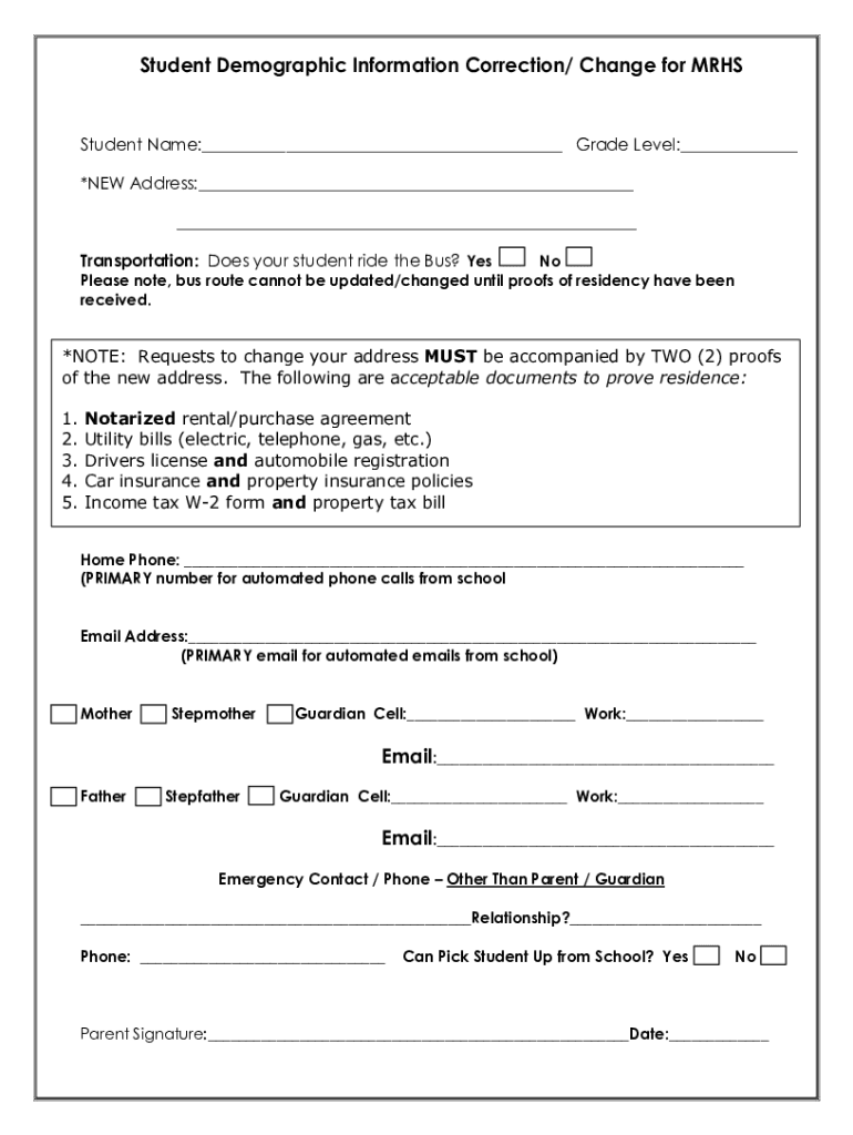 Student Demographic Information Correction/ Change for MRHSStudent Name:___ Grade Level:___ *NEW Address:___ ___ Transportation: Does your student ride the Bus? Yes No Please note, bus route cannot