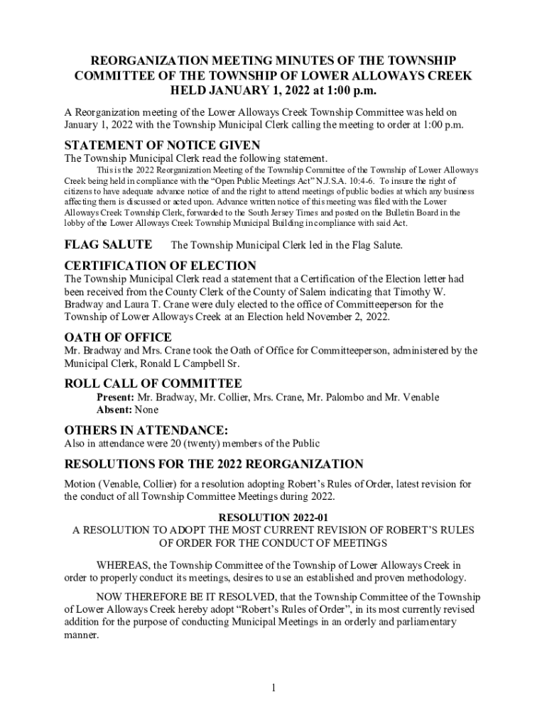 REORGANIZATION MEETING MINUTES OF THE TOWNSHIP COMMITTEE OF THE TOWNSHIP OF LOWER ALLOW AYS CREEK HELD JANUARY 1, 2022, at 1:00 p.m. A Reorganization meeting of the Lower Allows Creek Township Committee