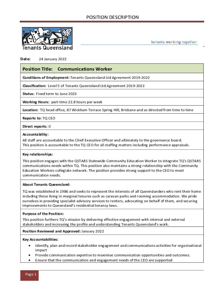 POSITION DESCRIPTIONDate:24 January 2022Position Title: Communications Worker Conditions of Employment: Tenants Queensland Ltd Agreement 20192022 Classification: Level 5 of Tenants Queensland Ltd