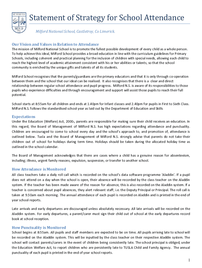 Statement of Strategy for School Attendance Milford National School, Castle troy, Co Limerick. Our Vision and Values in Relation to Attendance The mission of Milford National School is to promote
