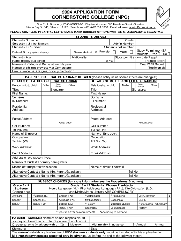 2024 APPLICATION FORMCORNERSTONE COLLEGE (NPC) Nonprofit Company, 2000/003322/08 Physical Address: 530 Morel eta Street, Silverton Private Bag X1840, Silverton, 0127 Telephone +27 (0)12 804 8350 Email