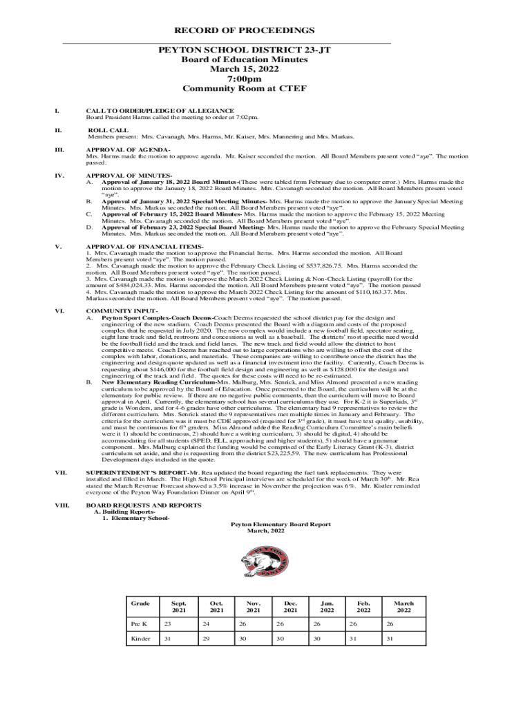 RECORD OF PROCEEDINGS ___ PEYTON SCHOOL DISTRICT 23JT Board of Education Minutes March 15, 2022 7:00pm Community Room at CHEF I.CALL TO ORDER/PLEDGE OF ALLEGIANCE Board President Harms called the