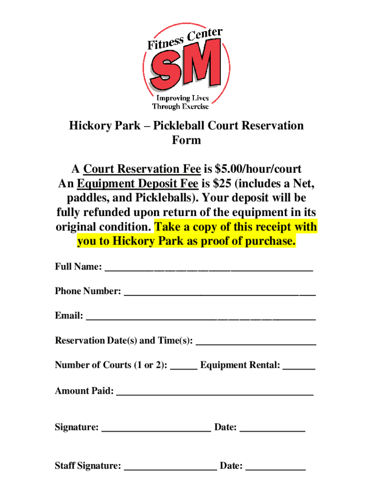 Hickory Park Pickleball Court Reservation Form A Court Reservation Fee is $5.00/hour/court An Equipment Deposit Fee is $25 (includes a Net, paddles, and Pickle balls). Your deposit will be fully refunded