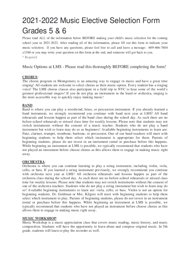 20212022 Music Elective Selection Form Grades 5 & 6 Please read All the information below BEFORE making your child\'s music selection for the coming school year in 20212022. After reading all the