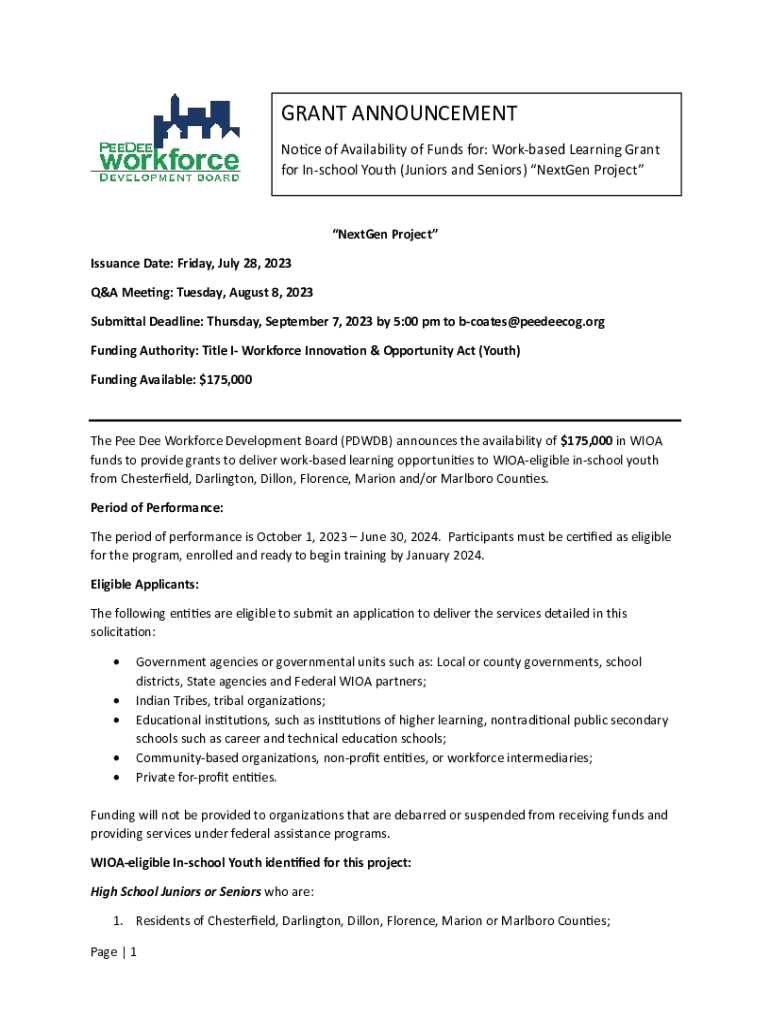 GRANT ANNOUNCEMENT Nice of Availability of Funds for: Work based Learning Grant for In school Youth (Juniors and Seniors) Next Gen ProjectNextGen Project Issuance Date: Friday, July 28, 2023 Q&A Been: