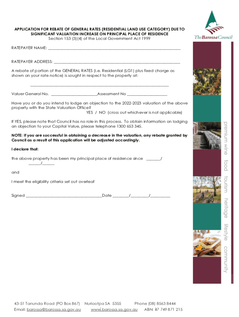 APPLICATION FOR REBATE OF GENERAL RATES (RESIDENTIAL LAND USE CATEGORY) DUE TO SIGNIFICANT VALUATION INCREASE ON PRINCIPAL PLACE OF RESIDENCE Section 153 (3)(4) of the Local Government Act 1999 RATEPAYER