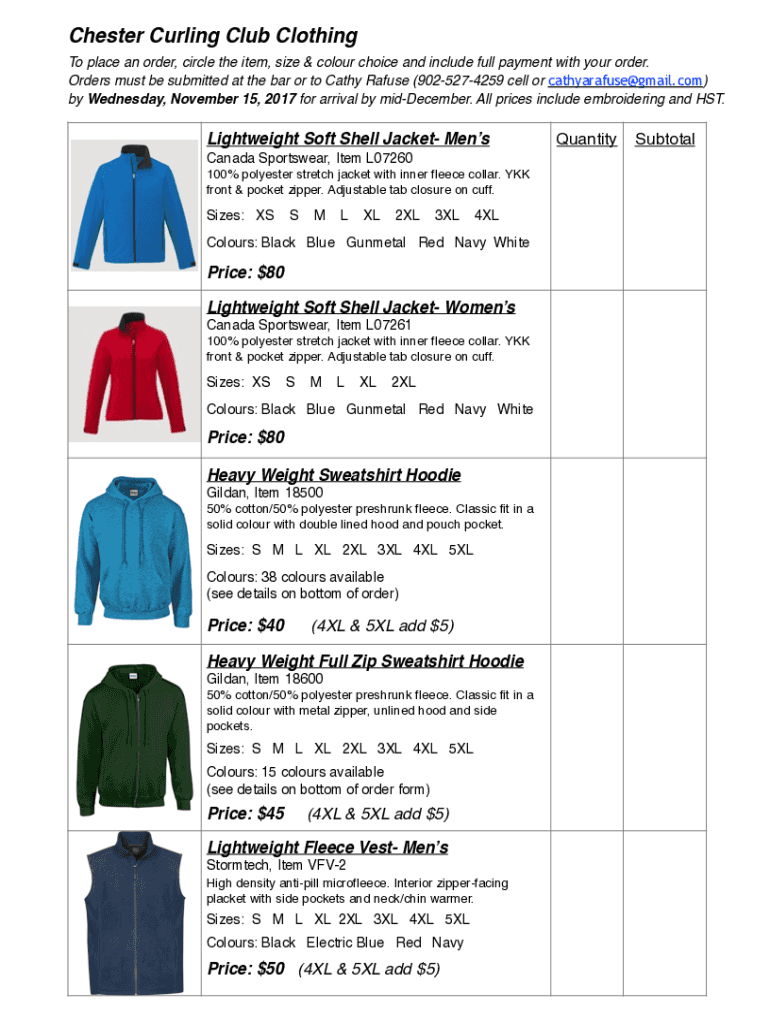 Chester Curling Club Clothing To place an order, circle the item, size & color choice and include full payment with your order. Orders must be submitted at the bar or to Cathy Refuse (9025274259 cell