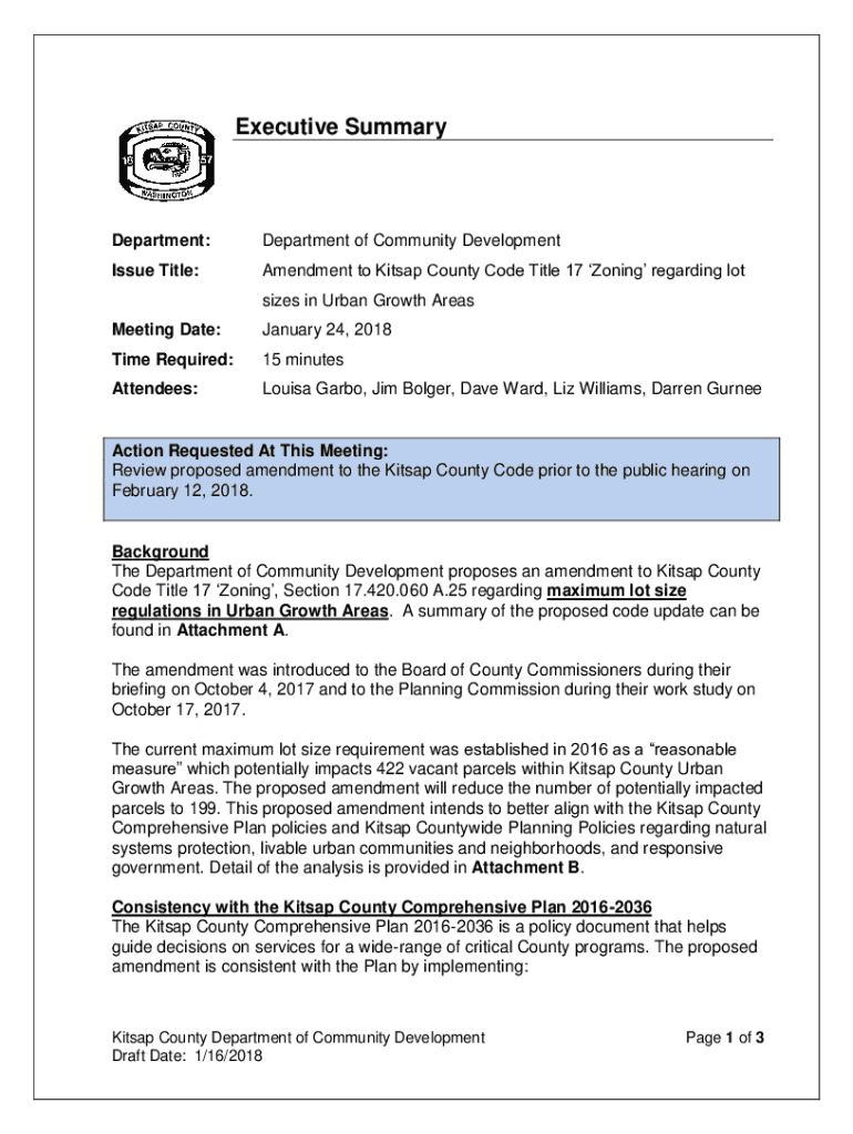 Executive SummaryDepartment:Department of Community DevelopmentIssue Title:Amendment to Kitsap County Code Title 17 Zoning regarding lot