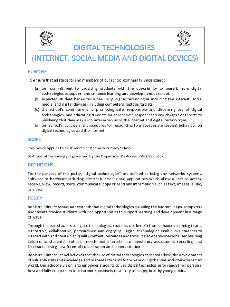 DIGITAL TECHNOLOGIES (INTERNET, SOCIAL MEDIA AND DIGITAL DEVICES) PURPOSE To ensure that all students and members of our school community understand: (a) our commitment to providing students with