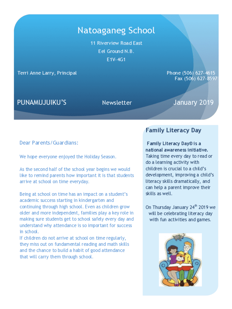 Natoaganeg School 11 Riverview Road East Eel Ground N.B. E1V4G1 Terri Anne Larry, PrincipalPUNAMUJUIKUSPhone (506) 6274615 Fax (506) 6278597NewsletterJanuary 2019Family Literacy Day Dear Parents/Guardians: